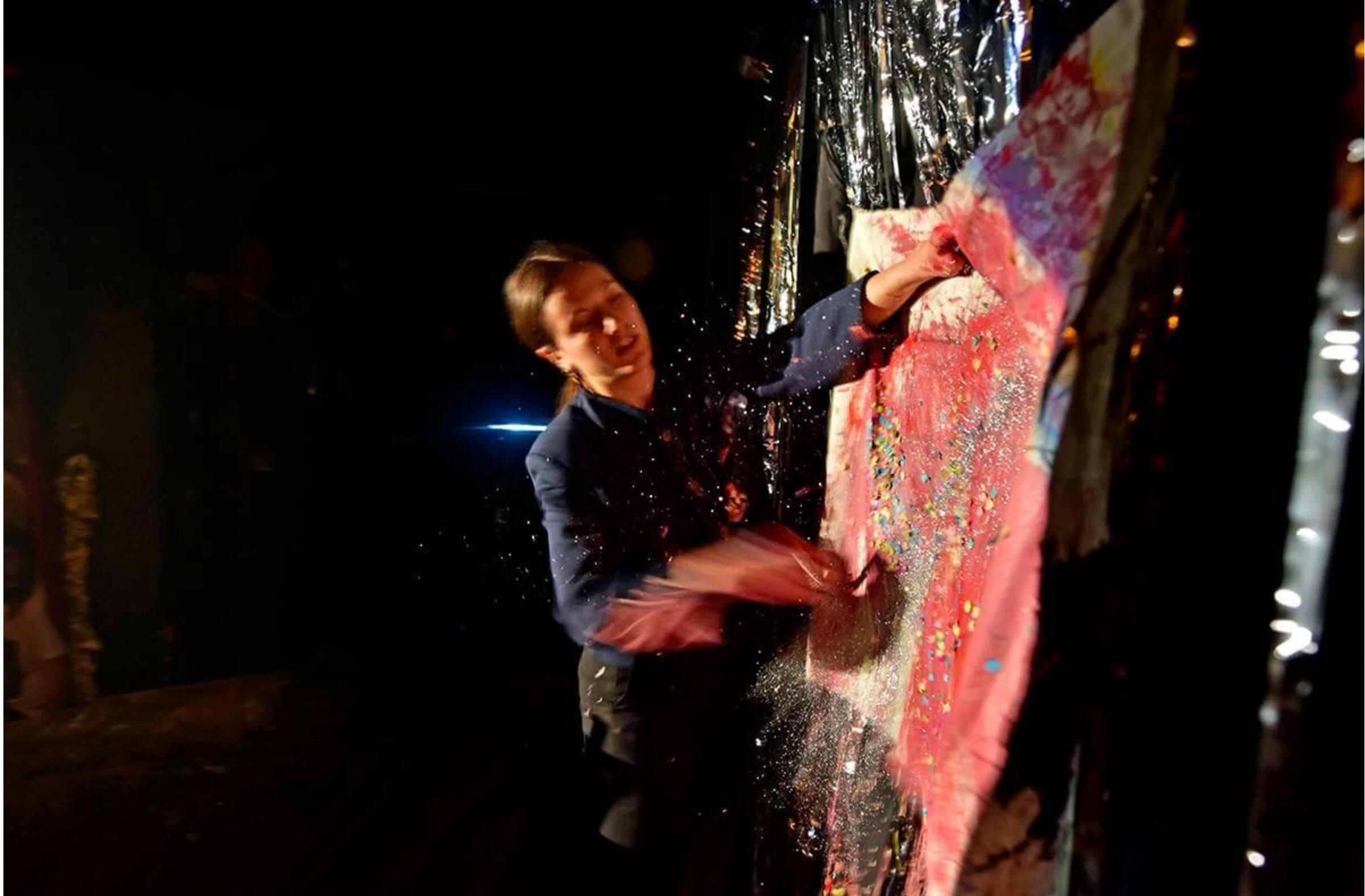A live video camera, a luminaire and a window are the three stage elements through which the bodies of the two dancers and the kinetic material are framed.